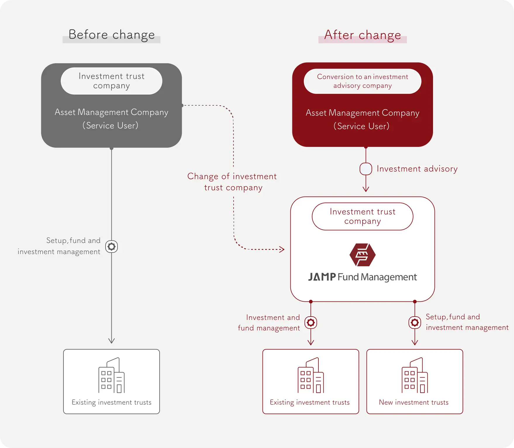 JAMP Fund Management addresses these challenges by offering a Fund Management Company service. Through this service, asset managers can transfer their existing mutual funds to us and transition into an investment advisory firm or a discretionary investment management firm. This allows them to step away from the regulatory obligations of operating a mutual fund management business and concentrate on their true value-added activities—making investment decisions and developing investment strategies.