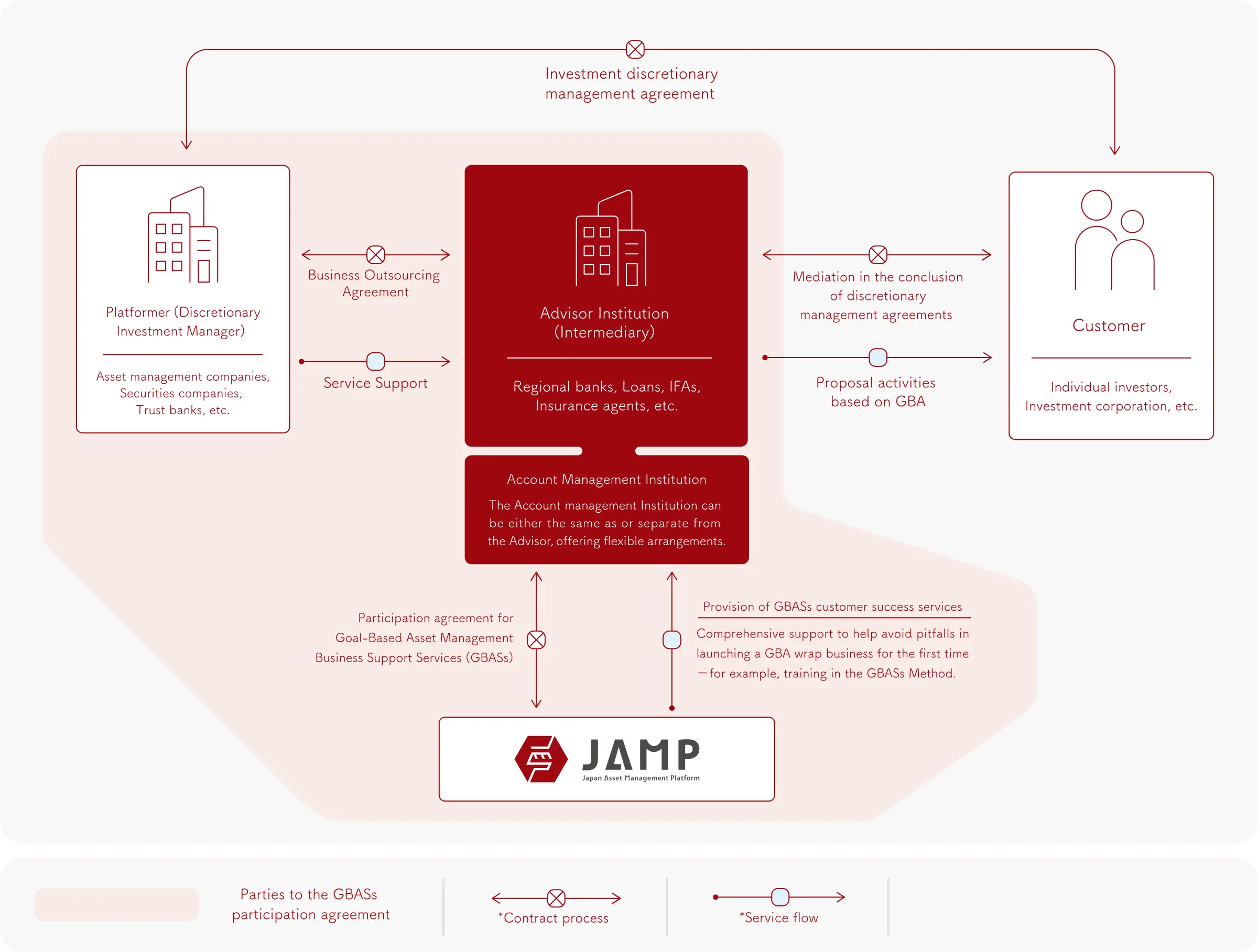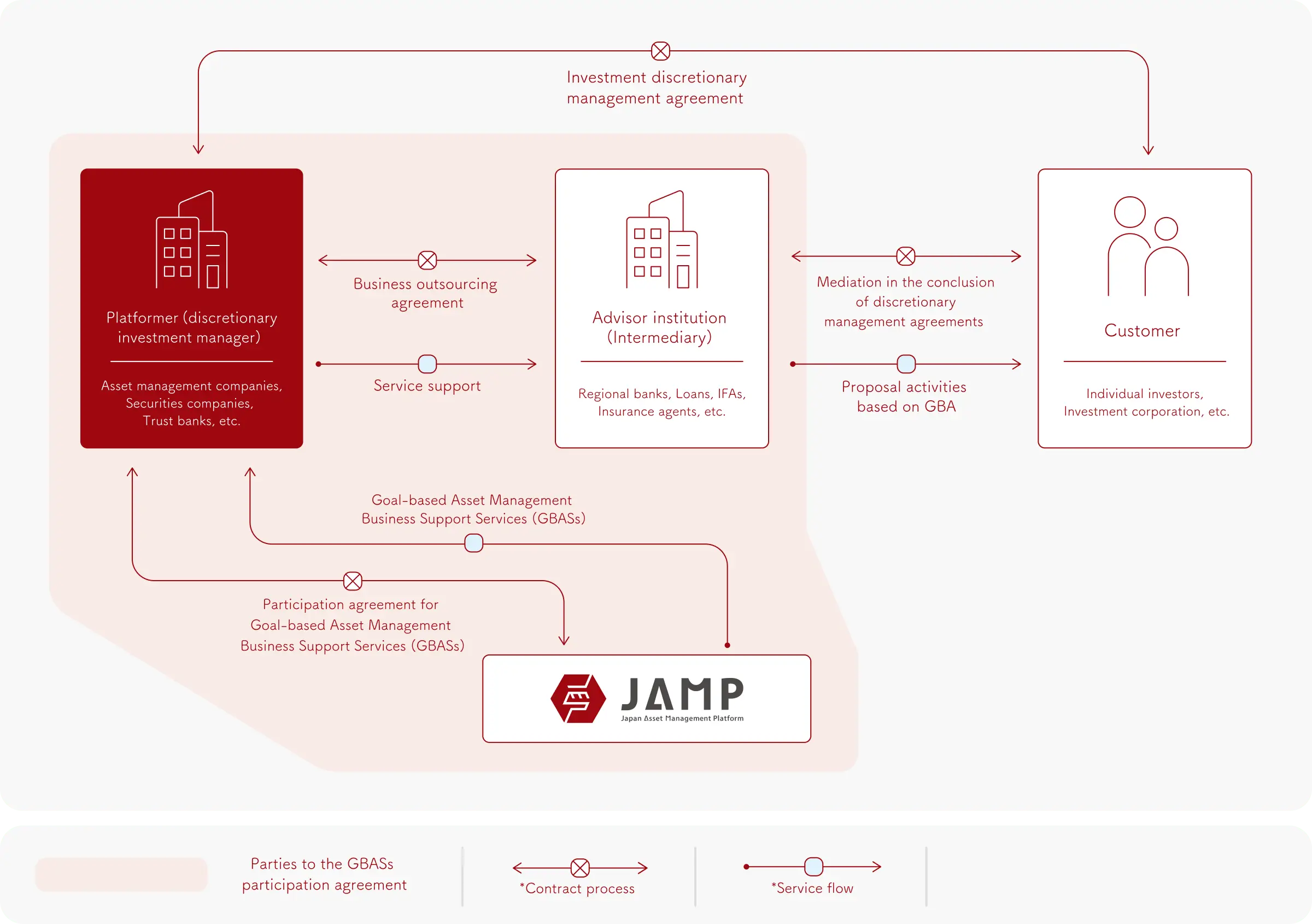 Asset management companies, securities firms, and trust banks serve as Platform Providers, working in collaboration with regional banks, securities brokers, credit unions, and IFAs (collectively referred to below as Advisory Institutions) to establish a new goal-based approach (GBA) wealth management business.