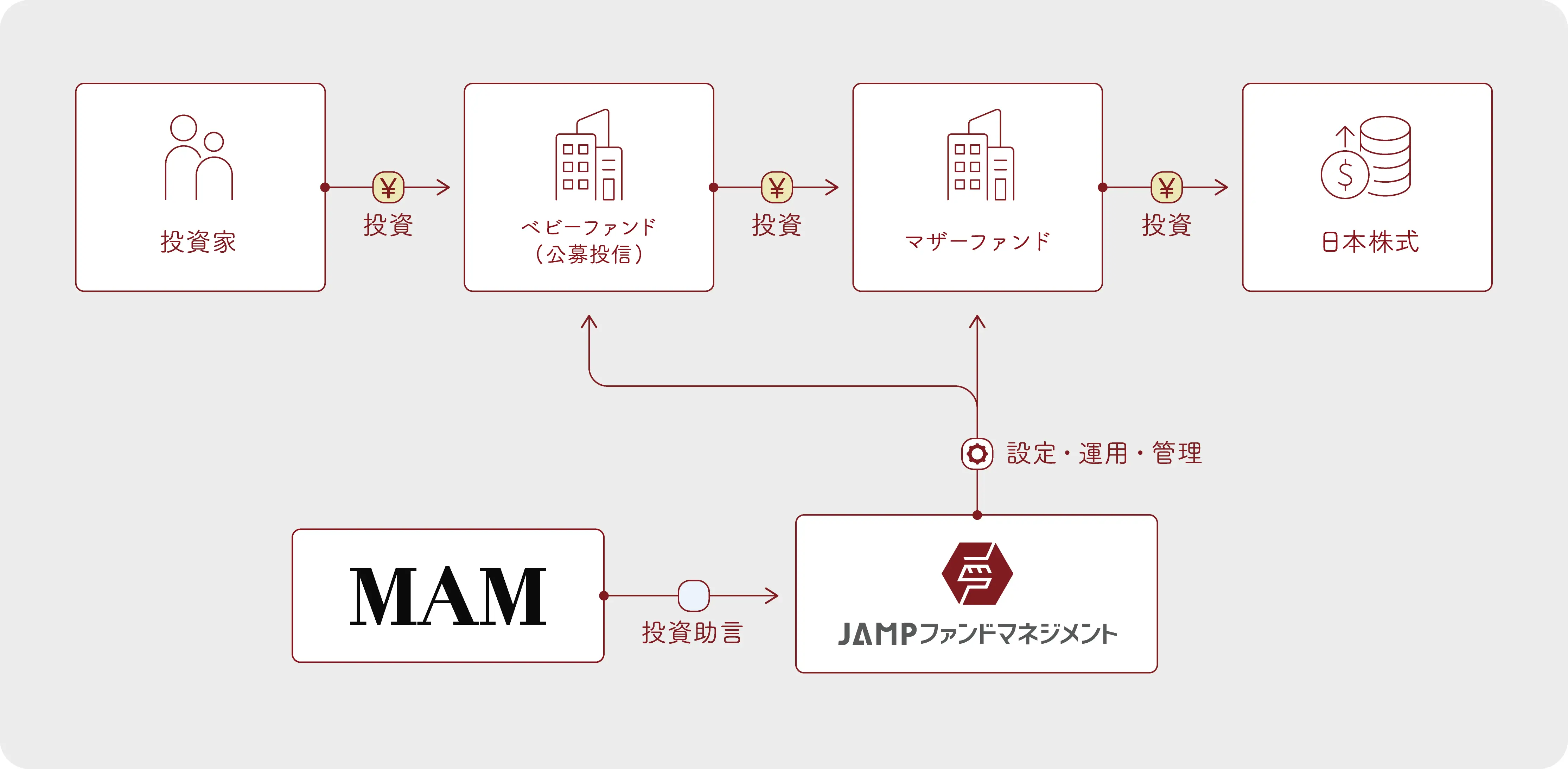 当社の投信ホワイトレーベルサービスにより、MAMは企業調査及び投資助言に専念することができ、当社がファンドの運営・管理を担うという役割分担のもとで、公募投資信託事業を効率的に運営することができます。