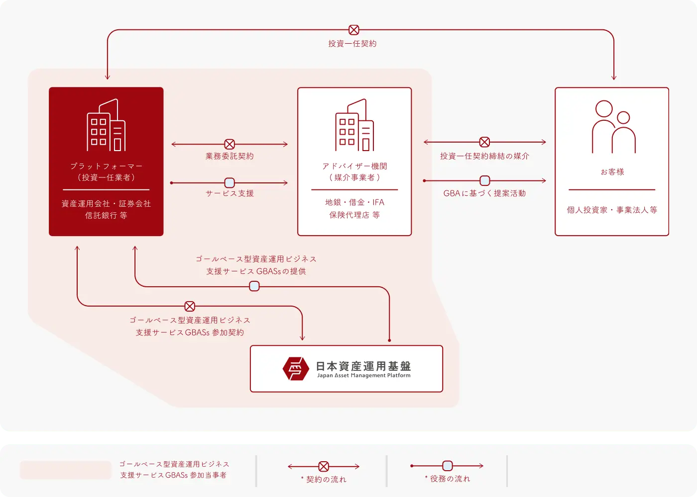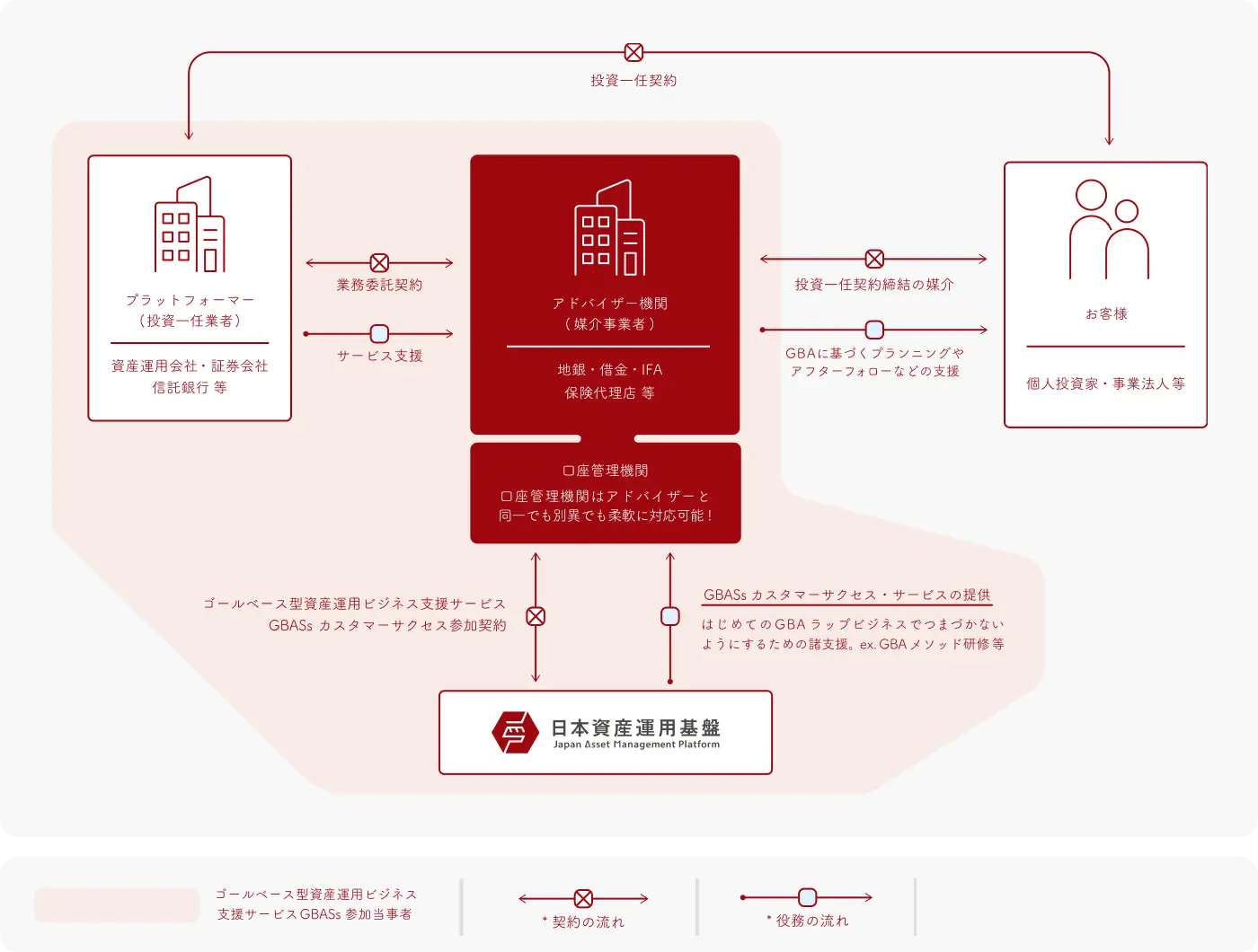 「アドバイザー機関」は、顧客に対する「GBAに基づくプランニング」及び「GBAに基づくアフターフォロー」に従事し、投資一任契約締結の媒介を行います。